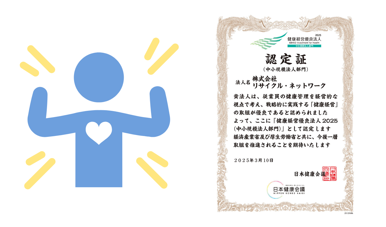 2025年3月10日、株式会社リサイクル・ネットワークは、経済産業省と日本健康会議が主催する「健康経営優良法人認定制度」において「健康経営優良法人2025(中小規模法人部門)」に認定されました。