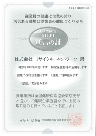 健康企業宣言「宣言の証」が届きました 2022年12月5日 皆さん、こんにちは! 営業部の大久保です。いつもリサイクラーブログを閲覧頂きまして有難うございます。本日は、自社の報告となります。この度、リサイクル・ネットワークでは従業員の健康づくりを進めていくにあたり「健康企業宣言」を行い、先日、協会けんぽ東京支部さんより「宣言の証」を受領い…続きを読む >>